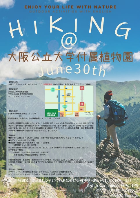 梅雨入りしたので月末の天気が少し心配ですが、イングリッシュチャットハウスでも今月の月末スペシャルイベントは⇒【ハイキング at 大阪公立大学付属植物園 in English】ということで電車に乗って少し遠出して森林浴の予定です。6月30日(木)開催で、平日ということもあり予定を組むのが少し難しいかもしれませんが、日常生活や都会の喧騒から離れ、英語を使って海外旅行気分を味わいつつ、いつの間にかスキルアップ♪